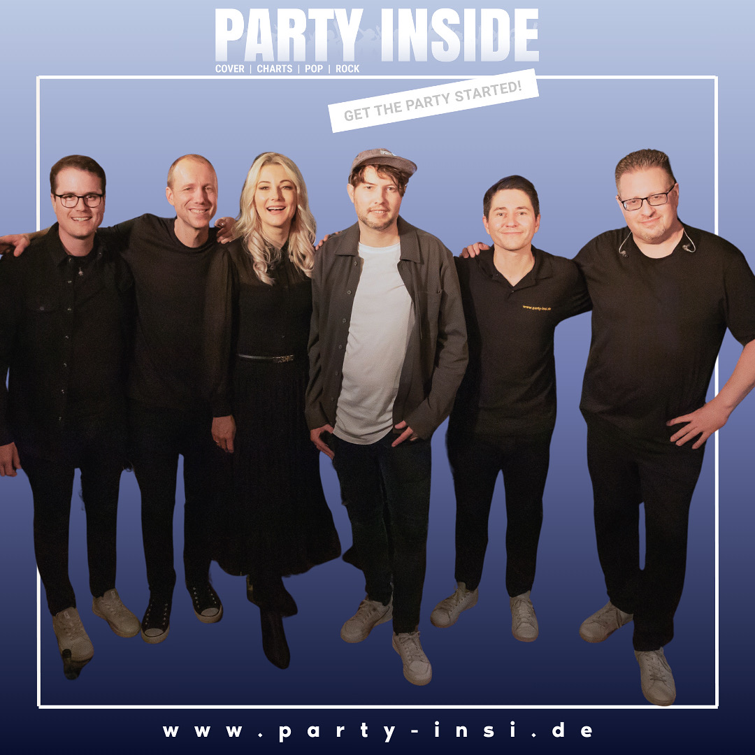 Party Inside – der Name ist absolut Programm: Seit 2002 bringt die Coverband quer aus ganz Baden-Württemberg stammend jede Party zum Kochen und macht jedes Event durch gute Live-Musik und tolle Stimmung zu einem unvergesslichen Erlebnis. Mit einem abwechslungsreichen Programm mit Hits aus den aktuellen Charts sowie Kultsongs der 70er/80er/90er/2000er trifft die Band jeden Geschmack – jung wie alt! Das Erfolgsrezept ist geballte Party-Musik zusammen mit Musikern, die Freude am Spielen haben und mit bester Laune zusammen mit dem Publikum feiern.